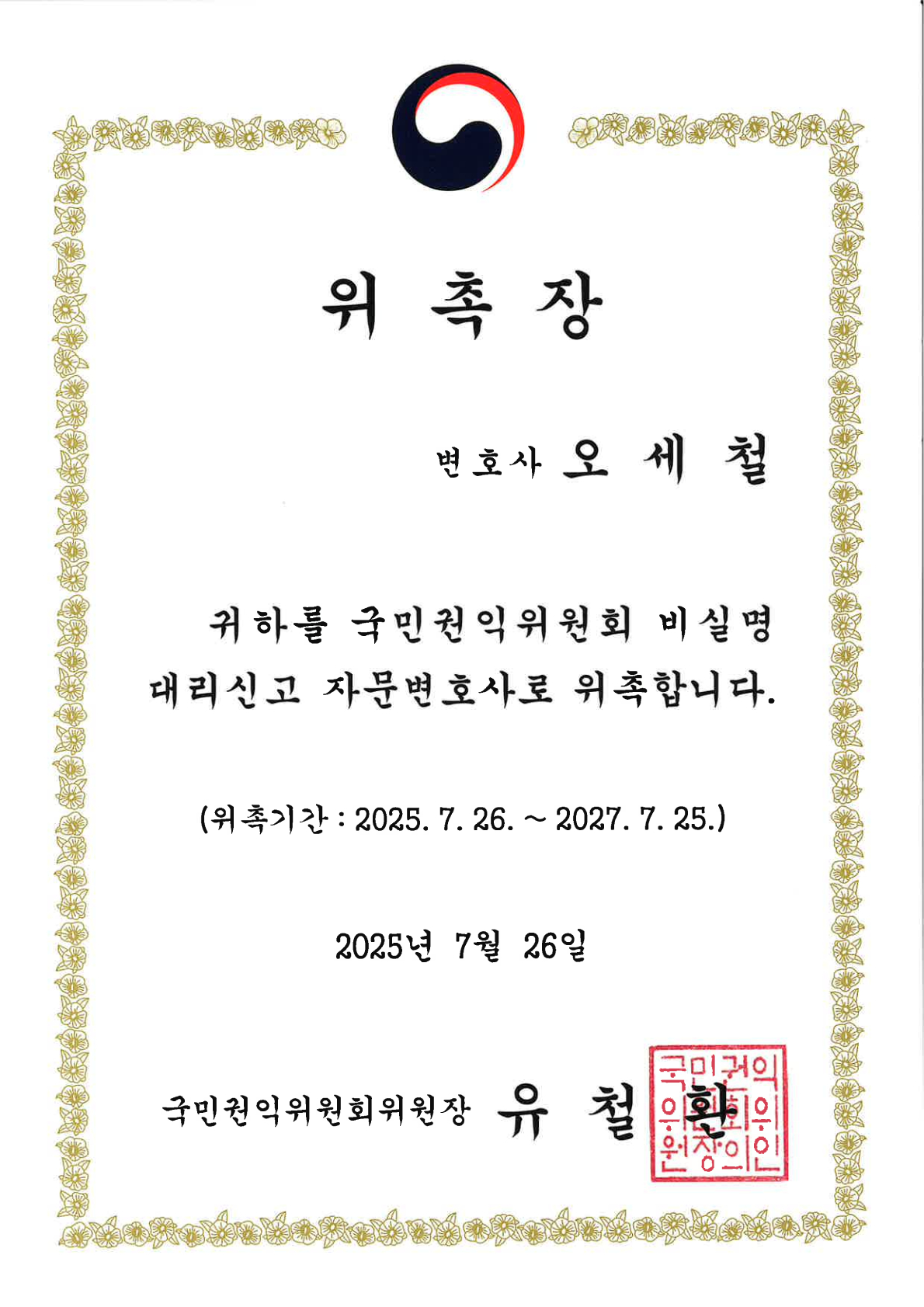 국민권익위원회에서 공식 위촉받은 비실명대리신고 자문변호사로서,