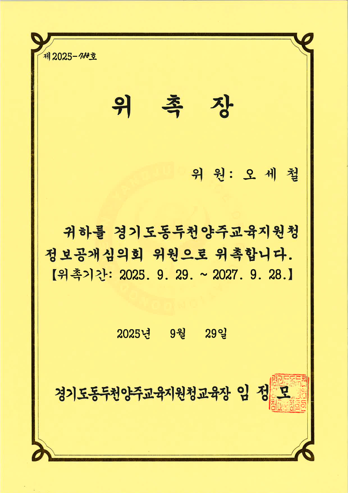 향동법률사무소 대표변호사가 경기도 동두천 양주교육지원청 정보공개심의회 위원으로 임명되었습니다.