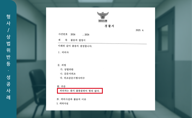 의뢰인에게 ‘혐의없음(증거불충분)’ 불송치 처분을 결정했습니다.